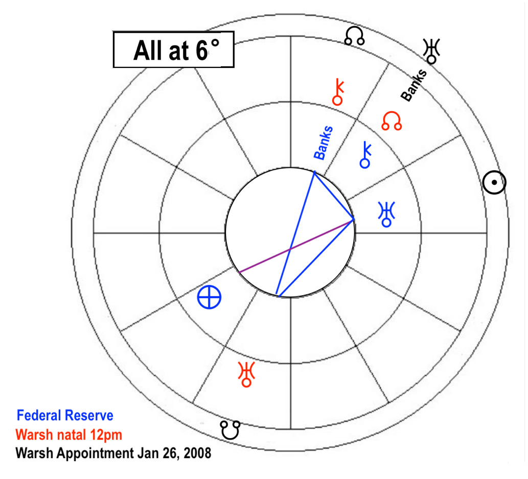 APPOINT MP Banks Uranus on WARSH NN and FED Chiron in the 8th: foreshadowing the monetary crisis currently evidenced by FED Progressed chart Yod to the same point, in my article “The Wanderer's Return to Jekyll Island”. Dealing with monetary crisis seems to be his destiny.