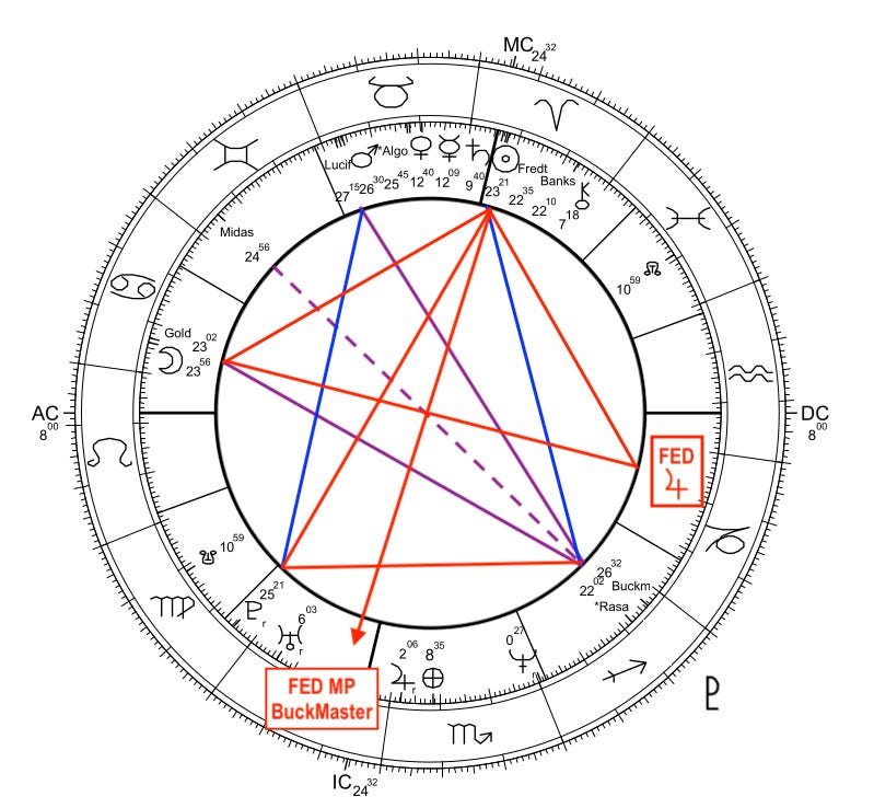 As we turn now to look at Warsh with The Fed, we are struck by the Cardinal Grand Cross that dominates their synastry. It involves all three of the Fed-related Minor Planets I have found to be relevant: MP Banks, MP FredTreasure, and MP BuckMaster.